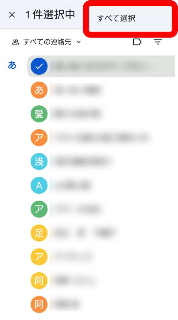 ① 旧携帯のGoogleコンタクト連絡帳を開きます。(※登録した件名が表示されない場合は画面下部の「連絡先」のアイコンをタップします。)そして、表示された件名の一つ(どなたの件名でもかまいません)を長押しします