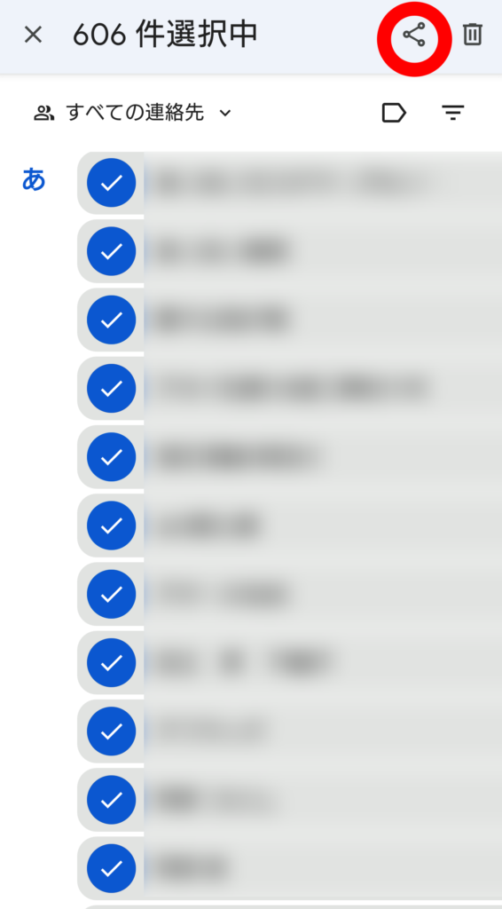 ③ 画面上部の共有マーク「をタップします。すると「連絡先をエクスポートしています(=本機から外部に出力する準備という意味)」という表示が現れ、エクスポートしたデータを共有できるアプリが表示されます