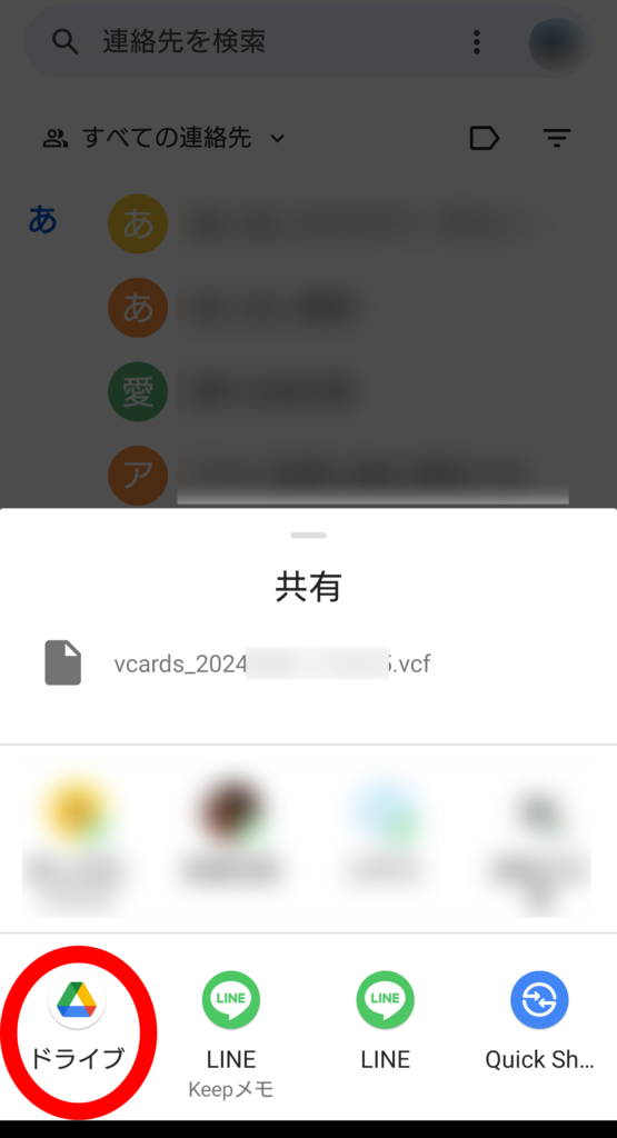 ④ 共有できるアプリの中からGoogleドライブ(クラウド)を選択し、エクスポートしたデータを保存します。エクスポートするデータのファイル名は「vcards 西暦 月 日時.vcf」となっています