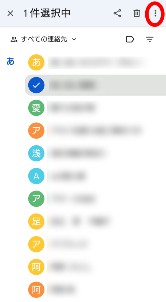 ② 長押しすると、画面上部に「共有」と「ゴミ箱」と「縦3点メニュー」のマークが出てきますので、縦3点メニューのアイコンをタップして,「すべて選択」を選びます