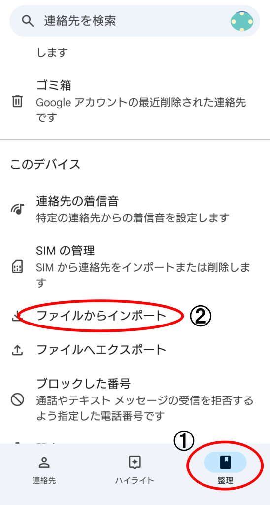 ④ PixelにもGoogleコンタクト連絡帳をインストールし、下部タスクの「整理」から「ファイルのインポート」を選択し、クラウドに保存したvcfファイルをタップする